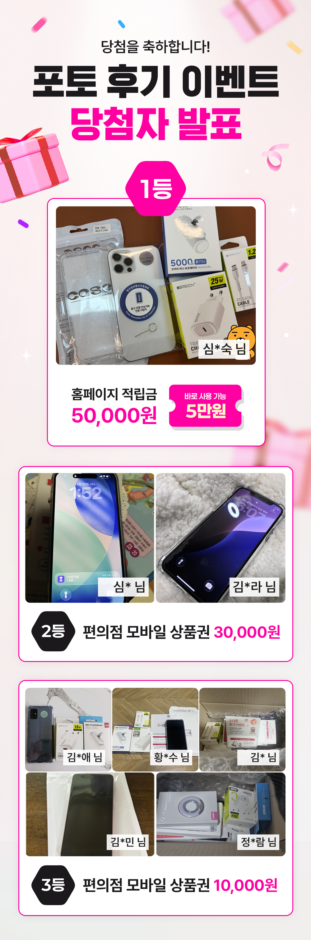 3등 : 편의점 쿠폰 10,000원 김*애 / 황*수 / 김*연 / 김*민 / 정*람