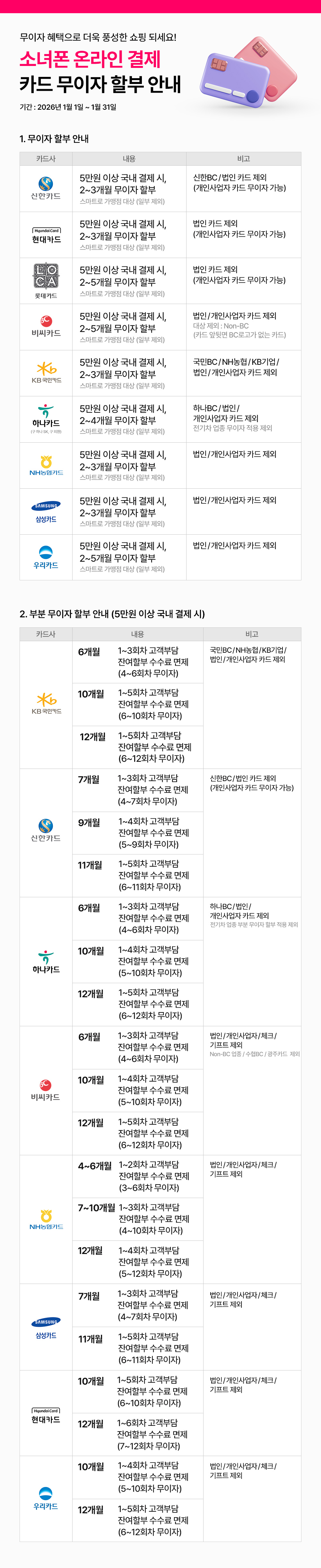 – 비씨카드 : 카드 앞/뒷면에 비씨 로고가 없는 NON-BC의 경우, 업종무이자 적용 제외